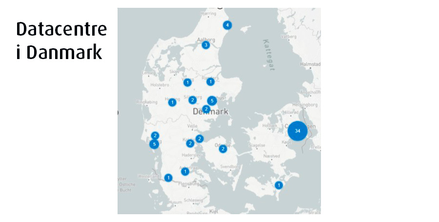 Kortet viser placeringen af 70 datacentre i Danmark – de 34 placeret i københavnsområdet, hvor drikkevands-udnyttelsesgraden ifølge GEUS i forvejen er over 250%.